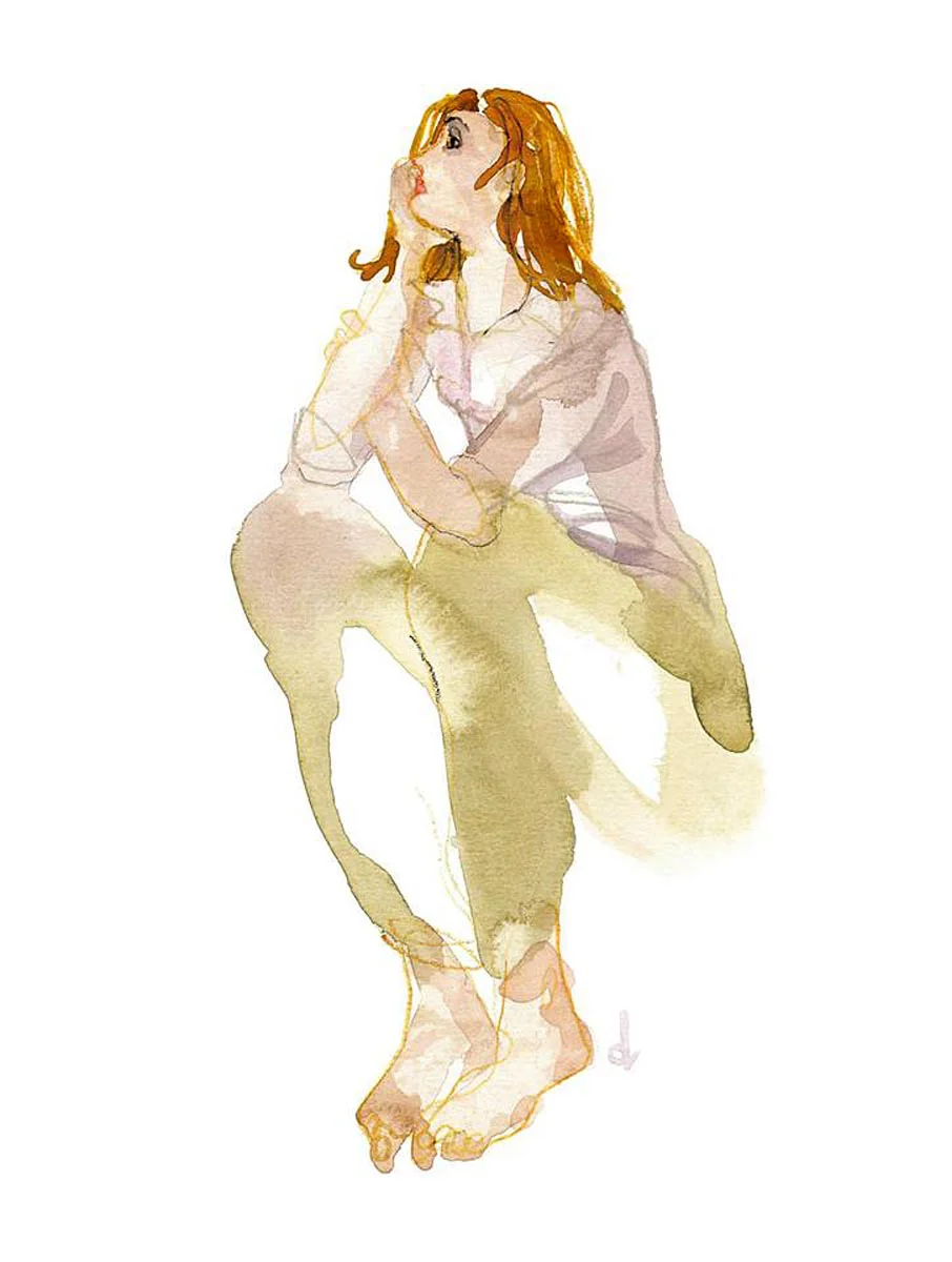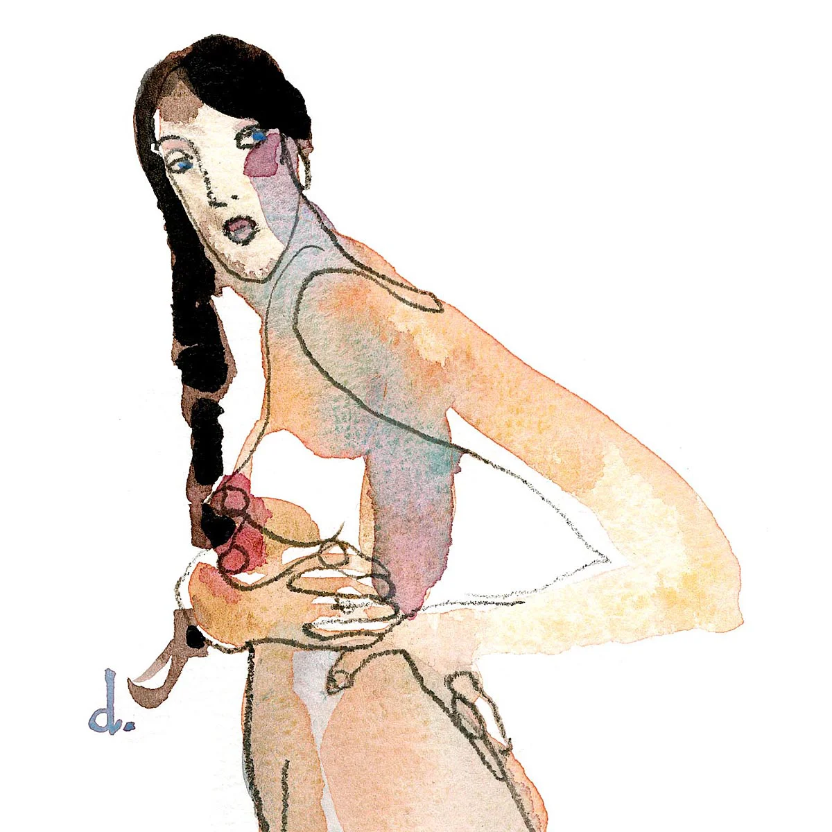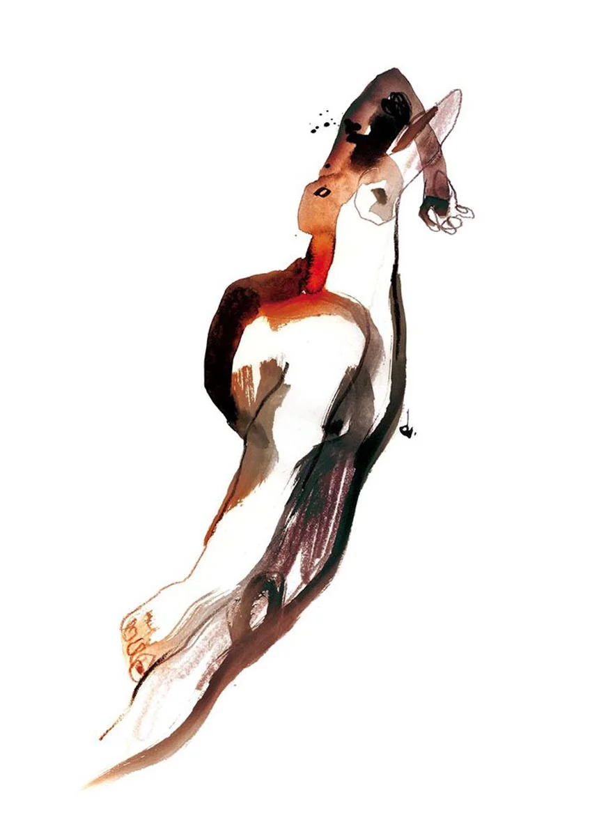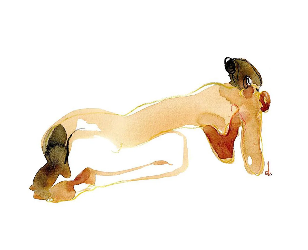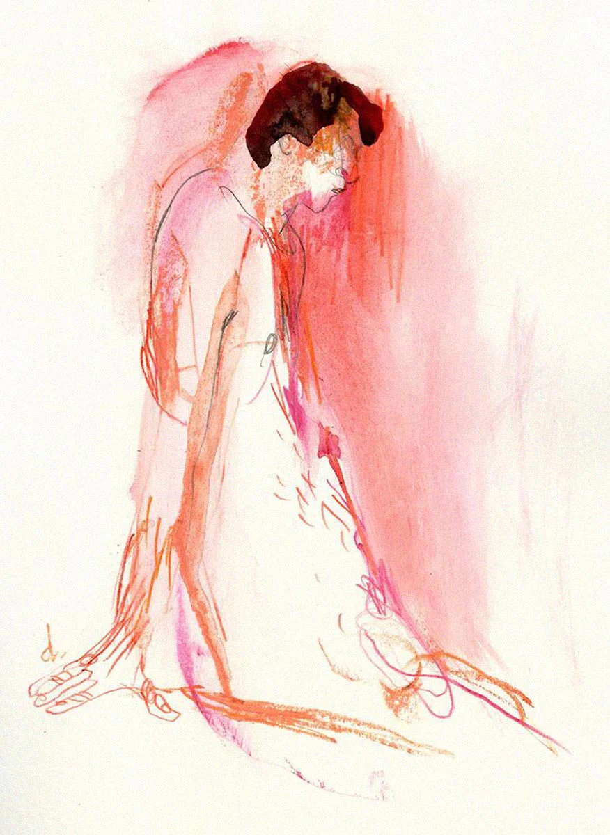 L’idée première est de faire mes gammes comme le ferait un musicien. En réalité, cela va plus loin que le simple exercice. À ce moment de la journée, ma main peut enfin se libérer des contraintes du travail de commande. Je la laisse s’exprimer, l’invitant à lâcher prise, à glisser vers l’inconnu en oubliant les règles élémentaires du dessin, comme le respect des proportions ou l’observation de la lumière. Les courbes du modèle sont prétextes à réinventer les formes. Je m’éloigne de la réalité, laissant mon pinceau allonger les corps, rapetisser les têtes, modulant le jeu du trait et des masses.
