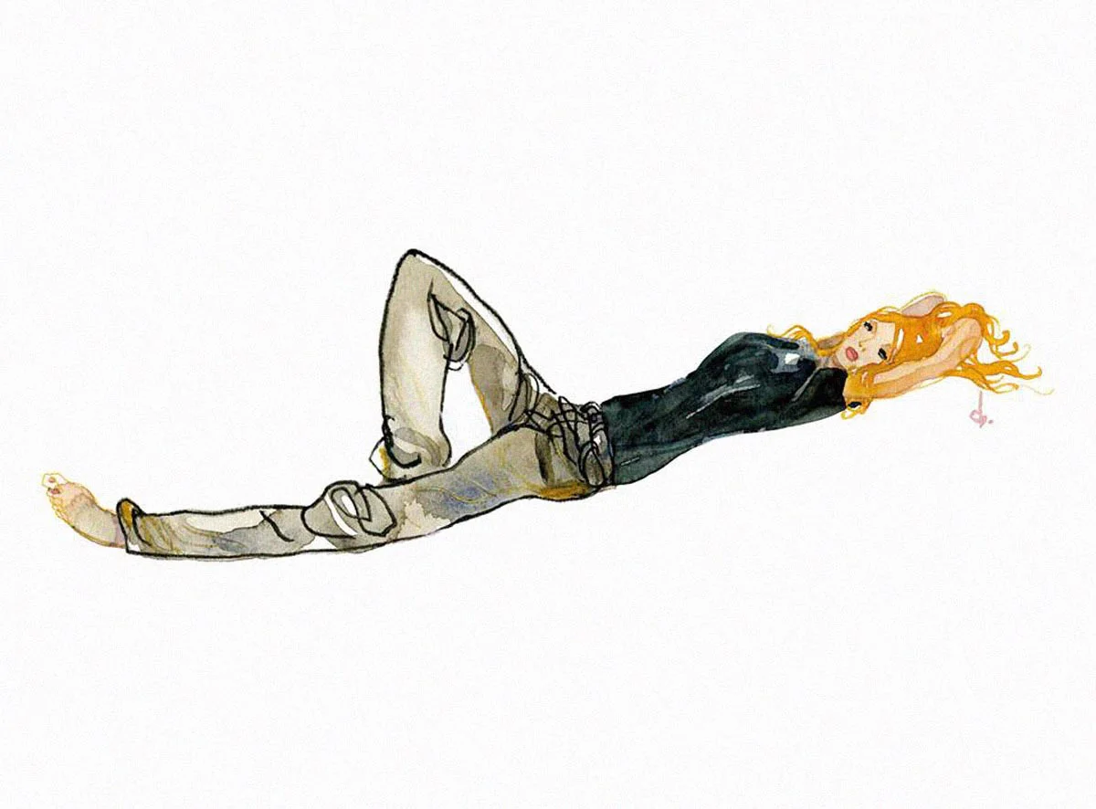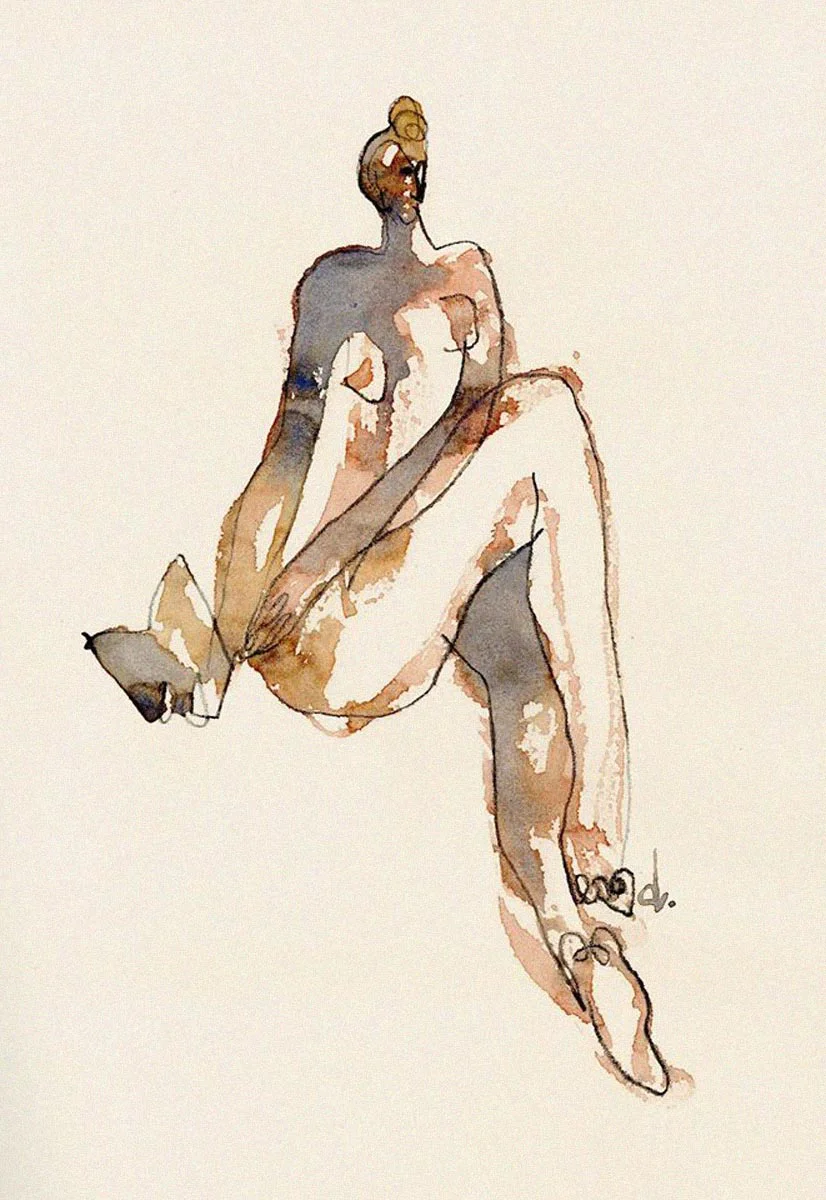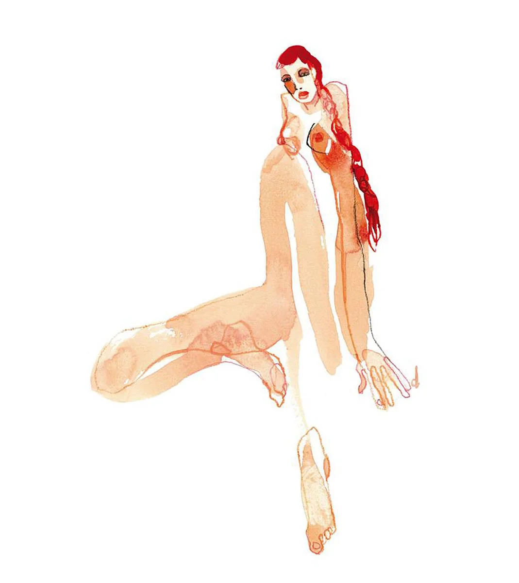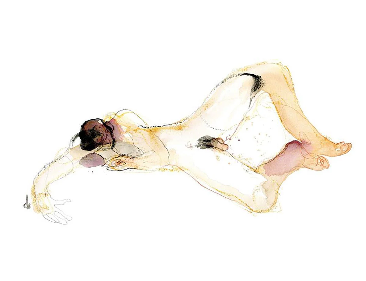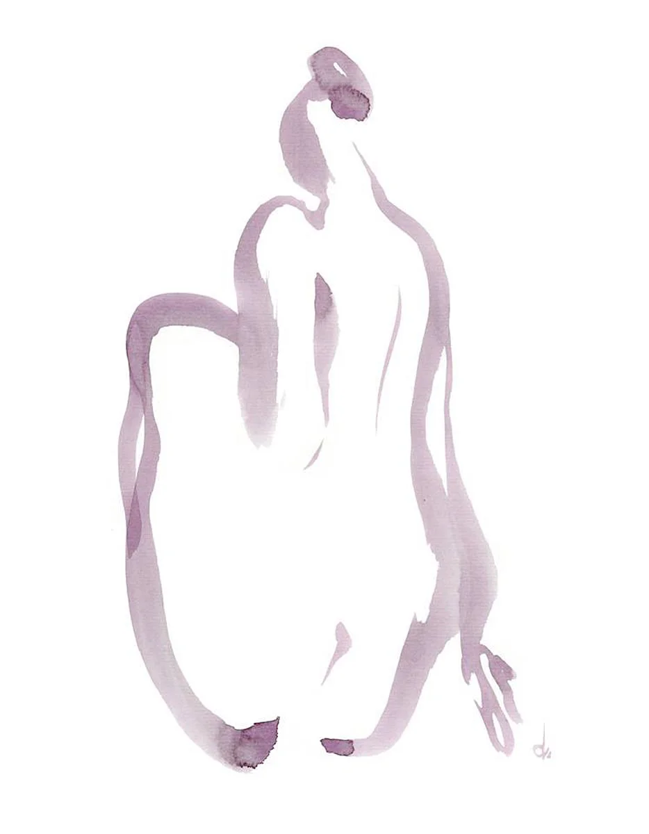 L’idée première est de faire mes gammes comme le ferait un musicien. En réalité, cela va plus loin que le simple exercice. À ce moment de la journée, ma main peut enfin se libérer des contraintes du travail de commande. Je la laisse s’exprimer, l’invitant à lâcher prise, à glisser vers l’inconnu en oubliant les règles élémentaires du dessin, comme le respect des proportions ou l’observation de la lumière. Les courbes du modèle sont prétextes à réinventer les formes. Je m’éloigne de la réalité, laissant mon pinceau allonger les corps, rapetisser les têtes, modulant le jeu du trait et des masses.