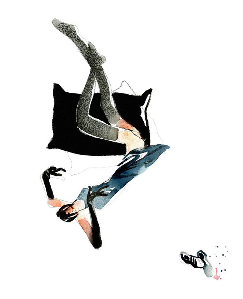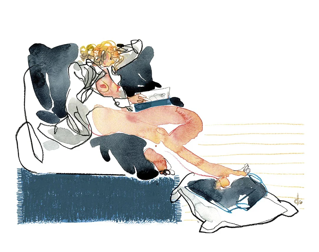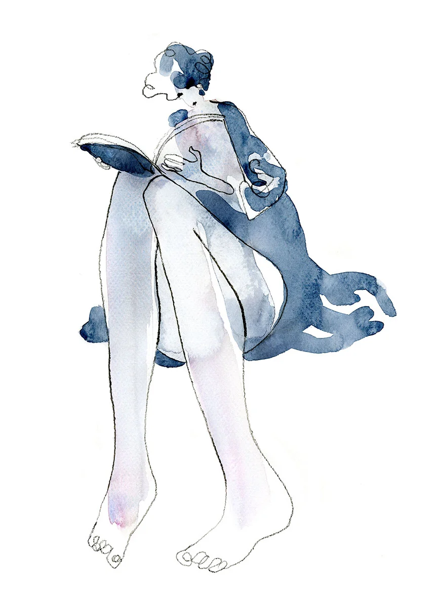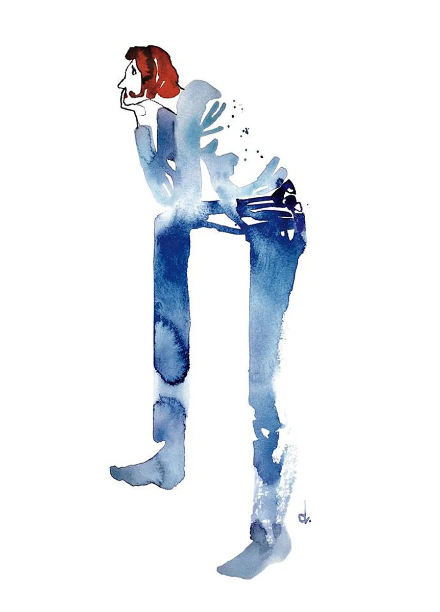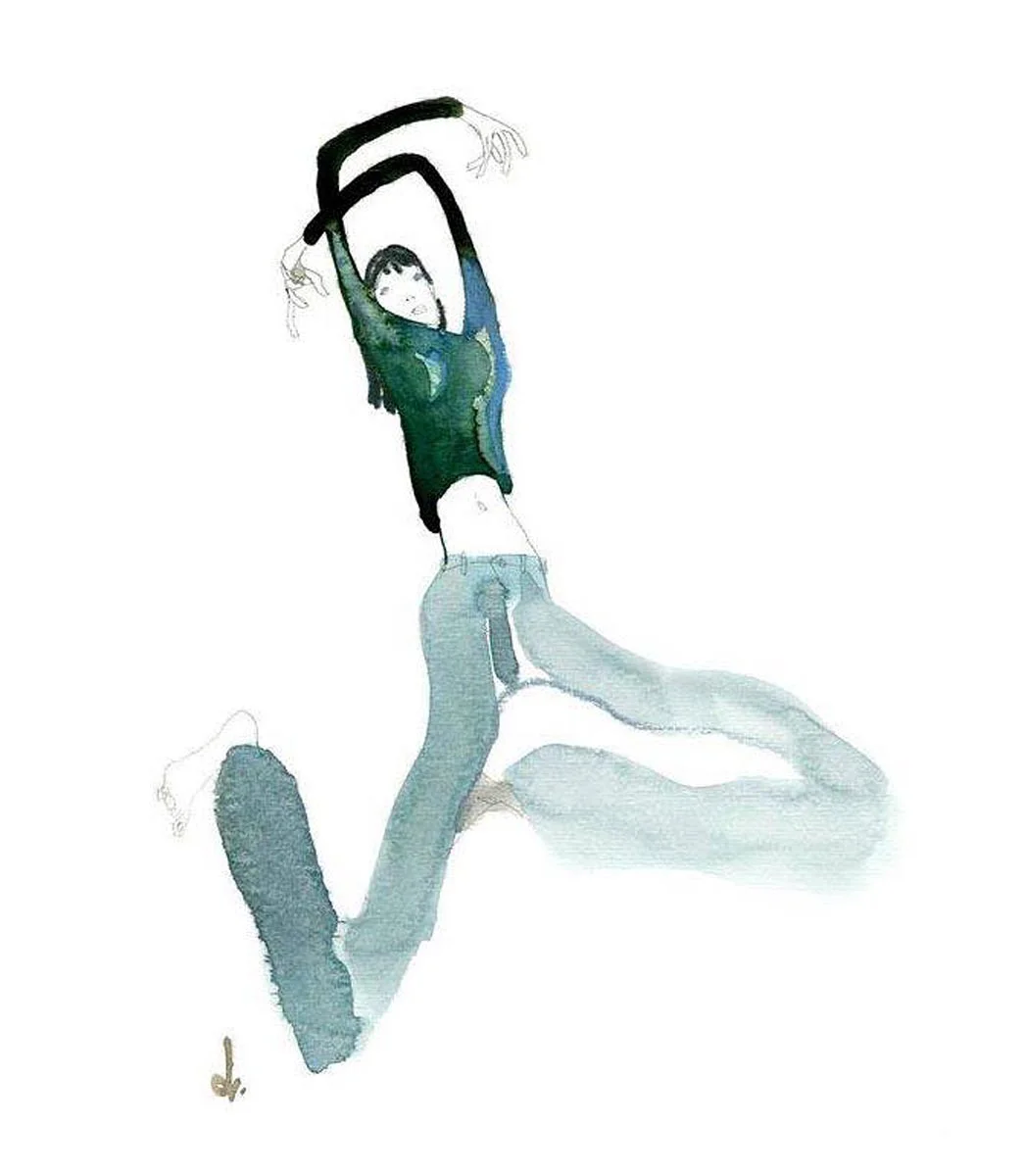 L’idée première est de faire mes gammes comme le ferait un musicien. En réalité, cela va plus loin que le simple exercice. À ce moment de la journée, ma main peut enfin se libérer des contraintes du travail de commande. Je la laisse s’exprimer, l’invitant à lâcher prise, à glisser vers l’inconnu en oubliant les règles élémentaires du dessin, comme le respect des proportions ou l’observation de la lumière. Les courbes du modèle sont prétextes à réinventer les formes. Je m’éloigne de la réalité, laissant mon pinceau allonger les corps, rapetisser les têtes, modulant le jeu du trait et des masses.